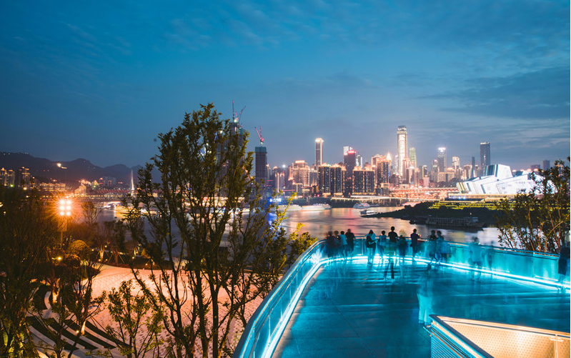 夜里星光点点,广场上华灯林立,站上观云廊将赏山城夜景、观两江交汇,光彩琉璃仿若置身于梦境国度。