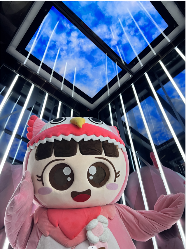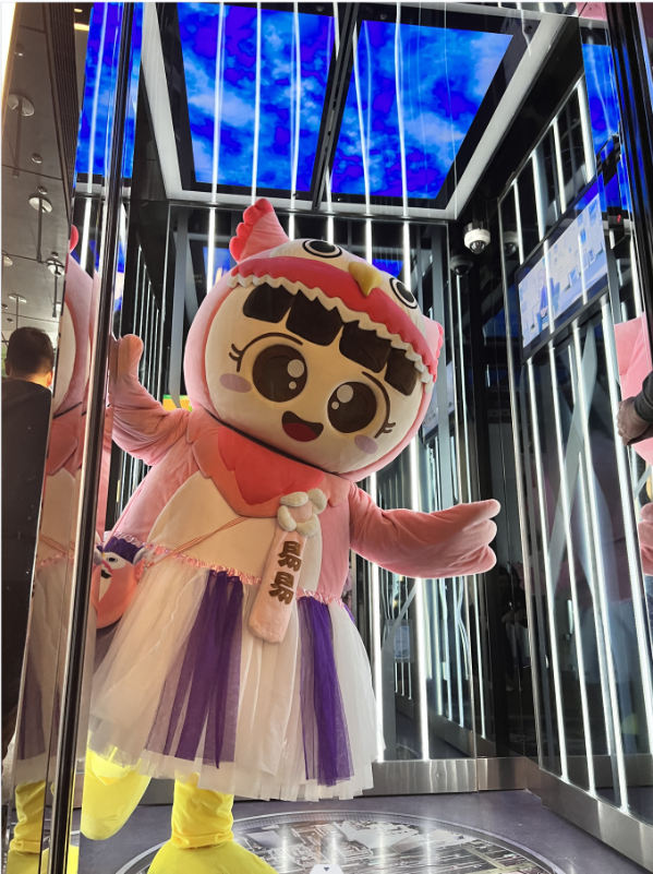 「易易」由香港设计师创作,获灌注「疗癒」和「欢乐」的核心价值,「易易」一身粉红系猫头鹰造型,是个爱笑又活泼开朗的招福精灵,她常挂在口边的口头禅「咕咕咕」,跟日文「不苦劳」的发音相似,正是时刻提醒大家要以正面思维处事,定立目标后持之以恒,终必能成功。为了让「易易」继续传播正能量,天际100精心计划由10月下旬起举办以「易易」为主题的特色活动,易易将会以全新造型亮相,其打扮配合天际100观景台特色,头戴环球贸易广场造型帽子,身穿天蓝色裙子并以云朵花边点缀。她将会不定期登场跟旅客见面,包括展出约1.8米高的大型「易易」公仔,供访客参观及拍照,场内更会特设四款「易易」邮戳盖章,旅客可集齐盖章邮寄明信片,届时天际礼品店更会有一系列的「易易」周边商品以供选购。