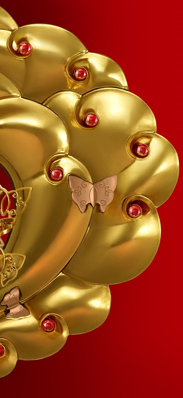 「富」字和牡丹花瓣采用了中国非遗金漆木雕的贴金箔技艺处理,紫檀蝴蝶榫卯固定,红宝石作为画龙点睛的点缀。金箔的富贵吉祥与红宝石的璀璨斑斓相得益彰,作品整体采用红金配色,一眼夺目,象征着春节的喜庆与繁荣。