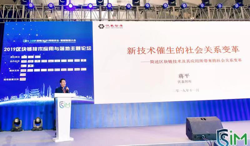 11月28日至30日,2019湖南(长沙)网络安全·智能制造大会(以下简称“智能制造大会”)在长沙国际会展中心举行,伏羲智库受邀参会。本届智能制造大会由湖南省委网信办、湖南省工业和信息化厅、湖南省科学技术协会、长沙市人民政府、中国电子信息产业集团有限公司共同主办,同期举行一场开幕峰会和四场高峰论坛。伏羲智库资深架构师蒋平在29日上午举行的“2019区块链技术应用与落地”高峰论坛做主题演讲并受邀参与圆桌讨论。蒋平认为,正统区块链技术将催生深刻的社会关系变革。