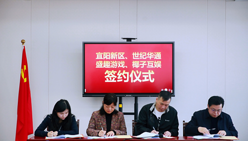 世纪华通CEO、盛趣游戏董事长王佶(右二)、椰子游戏董事长喻叶(左一)与宜春市宜阳新区代表签署合作协议