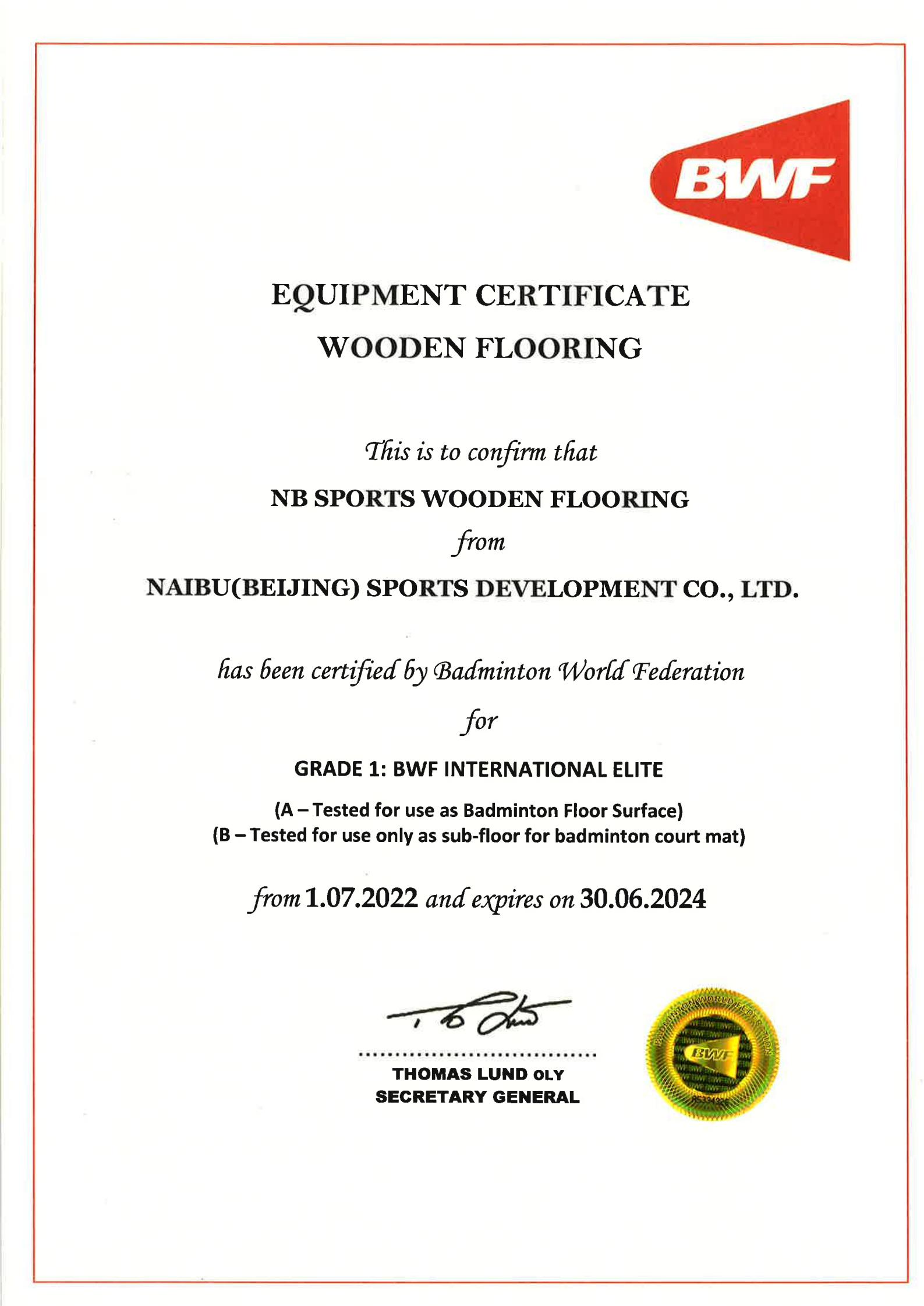 耐步体育工厂通过全球供应商社会责任BSCI认证,ISO质量/环境/职业健康管理体系认证。耐步公司旗下产品或服务涵盖运动木地板全生命周期,从面层处理、结构系统到安装施工、绘制漆线LOGO,再到打磨翻新、维护保养,产品通过国际篮联(FIBA)、世界羽联(BWF)、德国DIN、欧洲EN、欧盟CE标准和国家标准检测认证。